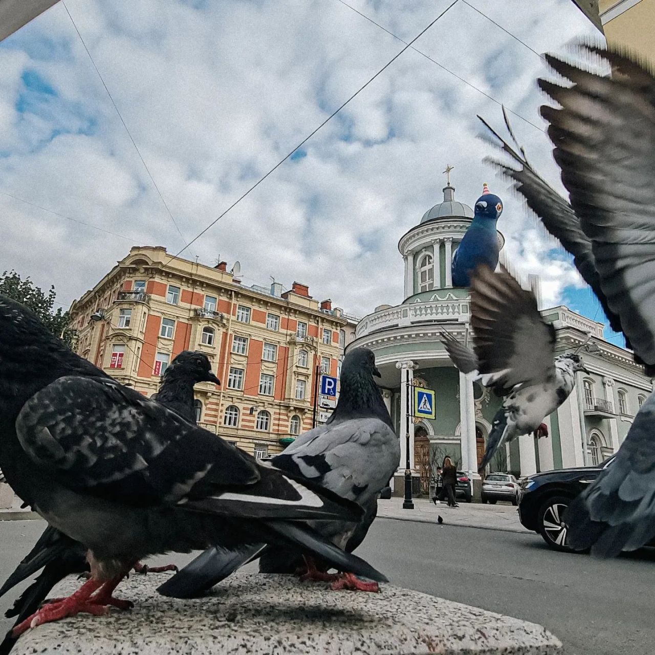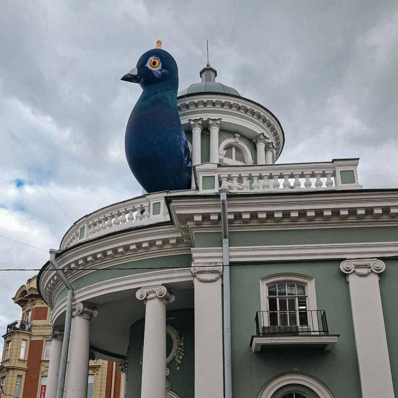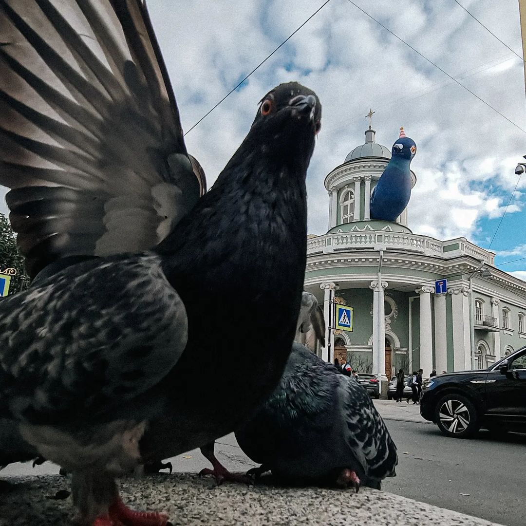 Большой надувной голубь Аннатолий на колокольне лютеранской церкви Аннекирхе. Голубь – символ выставки, посвящённой 300-летию первой церкви, которая располагалась на месте нынешней. Стиль и чувство юмора на уровне.