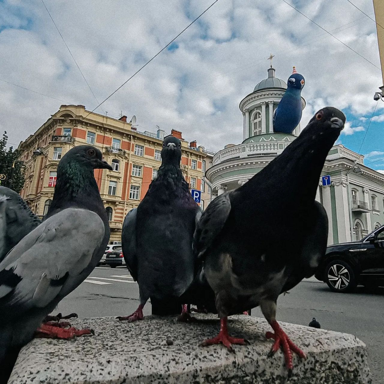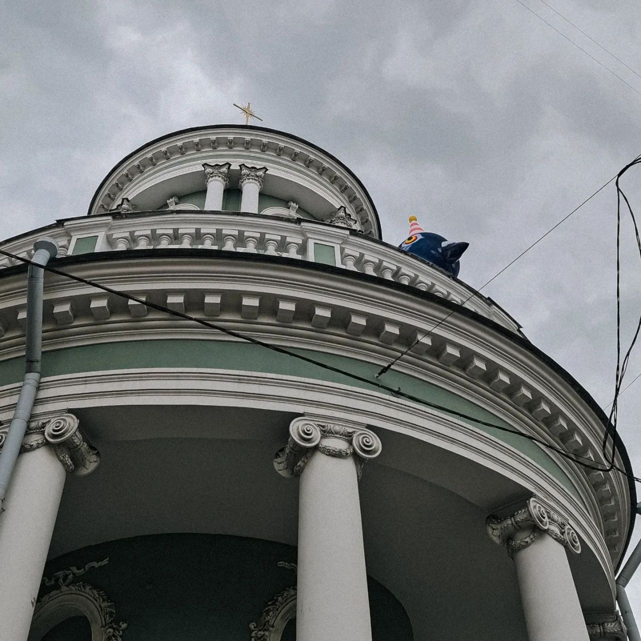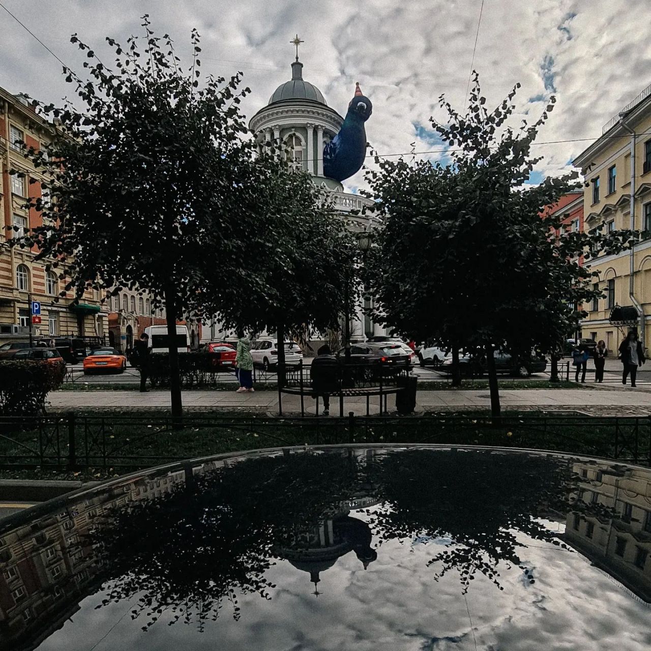 Большой надувной голубь Аннатолий на колокольне лютеранской церкви Аннекирхе. Голубь – символ выставки, посвящённой 300-летию первой церкви, которая располагалась на месте нынешней. Стиль и чувство юмора на уровне.